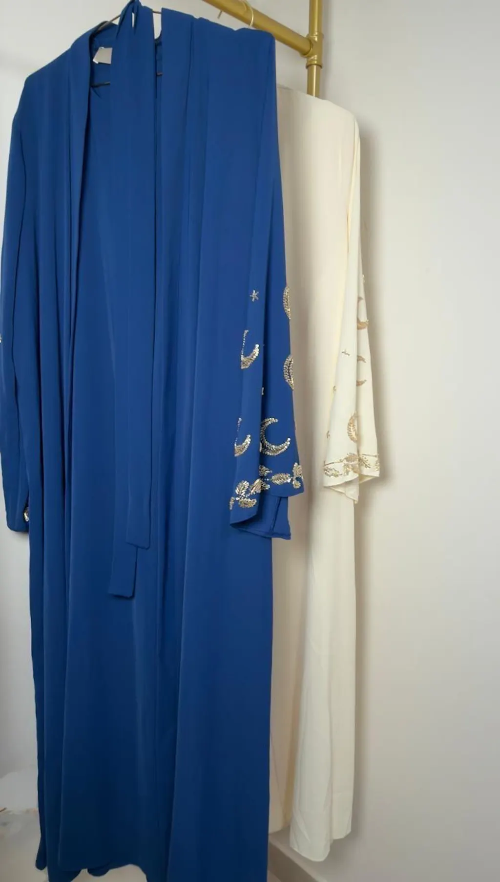 Elegant beige abaya featuring exquisite crystal moon and crescent embroidery on the sleeves. Perfect for Ramadan celebrations and special occasions. Premium quality fabric with stunning gold embellishments creates a luxurious and modest look.